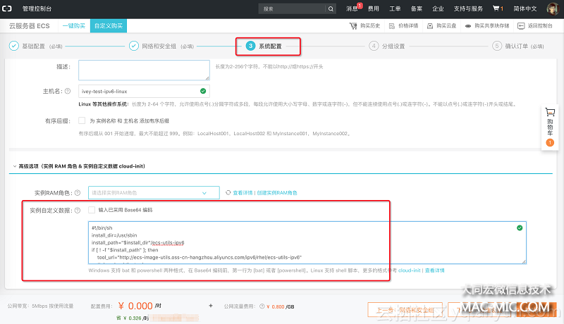 為了便于測(cè)試建議勾選 分配公網(wǎng) IP 地址,此公網(wǎng) IP 地址為 IPv4。根據(jù)頁(yè)面提示,在公測(cè)期間需要為實(shí)例配置 cloud-init 腳本即 實(shí)例自定義數(shù)據(jù)(暫時(shí)需要手工配置,未來(lái)系統(tǒng)會(huì)自動(dòng)處理),如下圖所示: