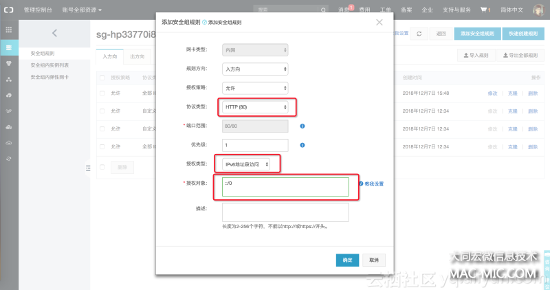 如果您的本機(jī)網(wǎng)絡(luò)支持 IPv6,可以為該實(shí)例 開(kāi)通 IPv6 網(wǎng)關(guān)公網(wǎng)帶寬,然后直接在本地瀏覽器里輸入 http://[your_ipv6_address] 即可訪問(wèn), 需要注意在該實(shí)例的安全組里配置 IPv6 入方向 80 端口。如下圖所示: