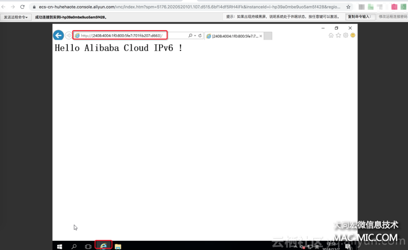 筆者由于本地網(wǎng)絡(luò)不支持 IPv6,因此又用上述步驟購(gòu)買(mǎi)了另一臺(tái) Windows 實(shí)例(配置好 IPv6),然后通過(guò) VNC(控制臺(tái)遠(yuǎn)程連接)連接該實(shí)例,然后通過(guò)瀏覽器訪問(wèn)上述第 7 步部署的 Web 服務(wù),如下圖所示: