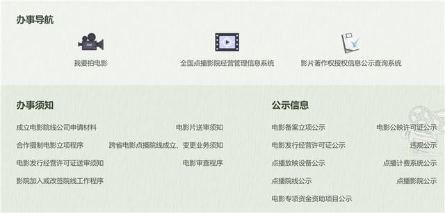 在國家電影局官網(wǎng)上,可以看到一些辦事導(dǎo)航,比如我要拍電影、全國點播影院經(jīng)營管理信息系統(tǒng)、影片著作權(quán)授權(quán)信息公示查詢系統(tǒng)等。