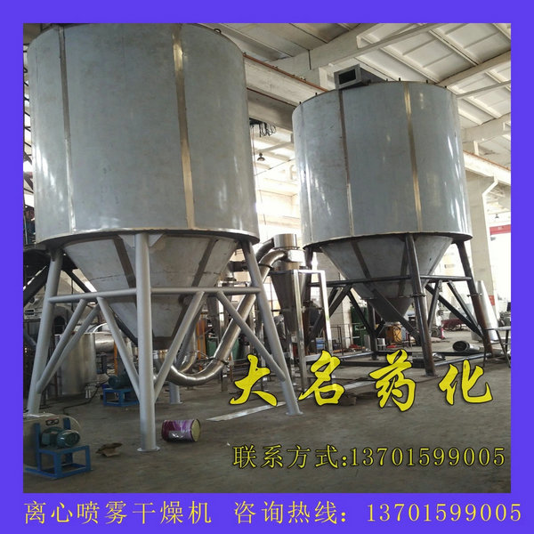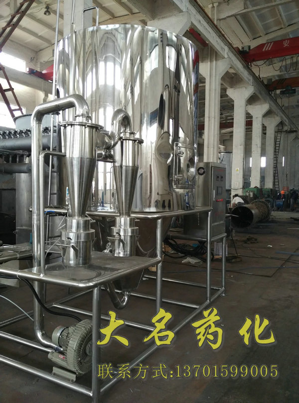 空氣經(jīng)過濾和加熱,進入干燥器頂部空氣分配器,熱空氣呈螺旋狀均勻地進入干燥室。料液經(jīng)塔體頂部的高速離心霧化器,(旋轉)噴霧成極細微的霧狀液珠,與熱空氣并流接觸在極短的時間內可干燥為成品。成品連續(xù)地由干燥塔底部和旋風分離器中輸出,廢氣由風機排空。